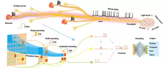 NRE-skin 的核心灵感来自于人类自身的皮肤和神经系统。它不再只是被动地传送信号,而是模仿了人类神经末梢主动产生脉冲信号的方式。皮肤上每一个微型压力传感器都连接一个脉冲发生器,当受到按压的时候,就会产生一连串电脉冲,按得越重、脉冲频率就越高。