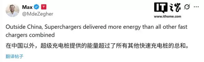 特斯拉全球充电业务高管 Max de Zegher 随后转发了该推文,并表示除中国市场外,超级充电桩所提供的能量已超过所有其他快速充电桩的总和。