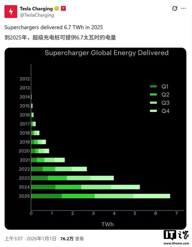 IT之家 1 月 1 日消息,特斯拉 @TeslaCharging 官方账号今日(2026 年 1 月 1 日)发布推文,宣布其旗下超级充电网络(Supercharger Network)在 2025 年全年累计输送电量高达 6.7 太瓦时(TWh),创造了全新的历史纪录。