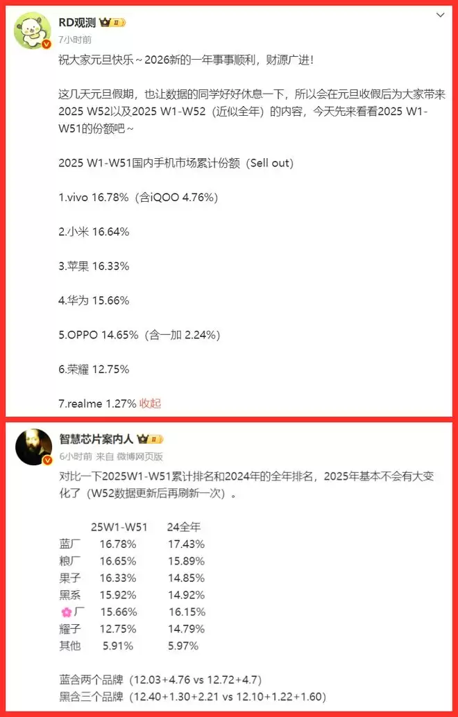 而根据多位博主透露的数据显示,截至2025年第51周的国内手机市场累计销量份额数据,前四名品牌之间的差距微乎其微: