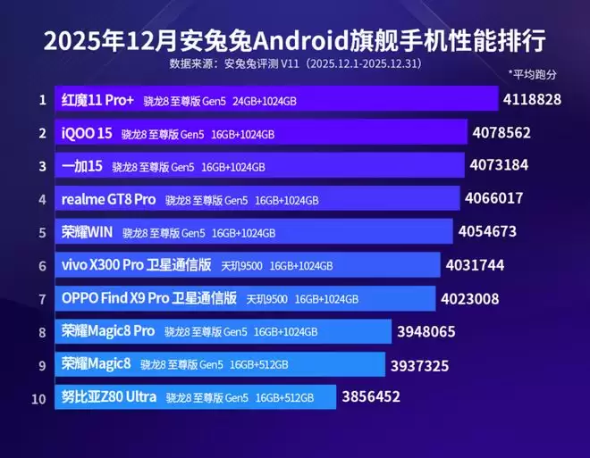 说实在的,12月的安卓旗舰性能榜本质上是一场骁龙8至尊版Gen5的内部阅兵,其中红魔11 Pro+以超过411万的平均分登顶,iQOO 15与一加15以微小差距紧随其后。