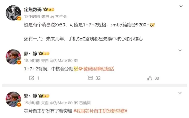 但另外一位博主指出1+7+2描述不准确,中核会进行分频设计,并且未来路线先换中核和小核是错误的。