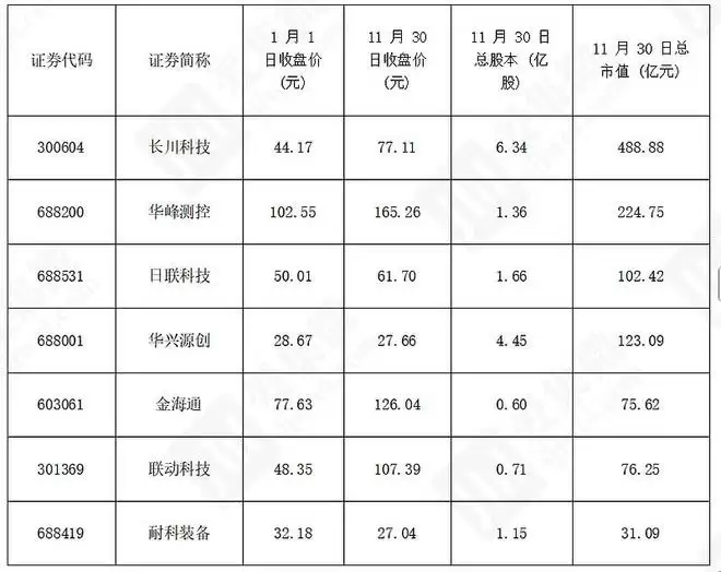 2025年,半导体后道设备行业股价普遍大涨,截止11月30日,涨幅前三名是联动科技(122.11%)、长川科技(74.57%)、华峰测控(12.82%),体现出国产半导体测试设备在高端化和国产替代浪潮中的强劲增长潜力。仅有耐科装备(15.97%)、华兴源创(3.52%)股价下跌。