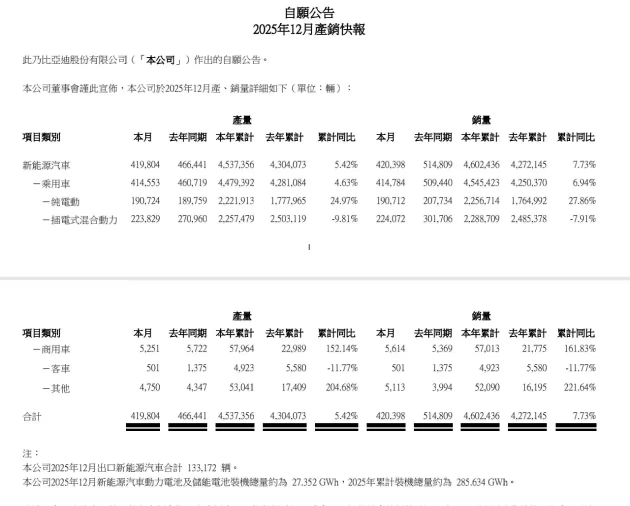 比亚迪股份近日在港交所发布了最新的销售数据公告,显示2025年12月新能源汽车销量出现一定幅度的波动。数据显示,当月新能源汽车销量约为42.04万辆,与去年同期相比下滑约18%。不过,从全年累计销量来看,比亚迪依然保持着增长态势;2025年全年累计销量达460.24万辆,累计同比增长7.73%。