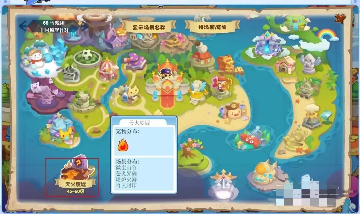 全新地图“天火废垒”位于世界地图的左下角区域。将地图画面向下拖动即可找到,这里主要栖息着各类火系宠物,同时也是“焚天之火”活动的举办地点。