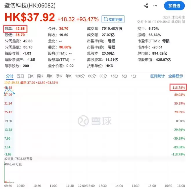 1月2日,高性能计算芯片公司壁仞科技正式登陆港交所主板。公司开盘报35.7港元,较发行价19.6港元暴涨82.14%,打响了新年港股市场头炮。开盘后,壁仞科技股价继续走高,盘中最高触及42.88港元,涨幅一度超过118%。