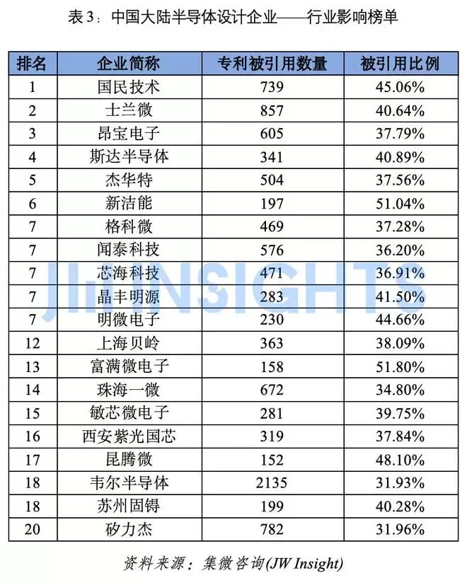 以专利被引用情况作为企业的技术对行业技术的贡献大小的参照。专利被引用的情况包括被其他专利文献公开引用,或在其他专利的实质审查程序中审查员将本专利文献作为对比文献在通知书或检索报告中引用。专利被引用比例的高低反映出企业披露的专利对应的技术方案的研究热度和业内关注活跃度,侧面反映出企业专利的技术先进性,可作为企业的技术对行业技术贡献度的体现。爱集微知识产权咨询基于国内半导体设计企业的专利被引用数量与比例的综合考虑,发布企业技术的行业影响力二十强榜单。