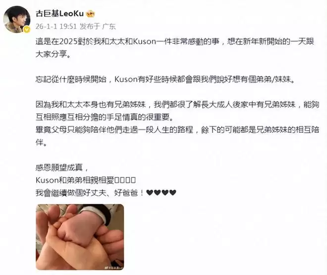 1月1日,2026年的第一天,歌手兼演员的古巨基就给大家带来了一个超级爆炸的消息,他二度当爸了!相信看到古巨基的发文后,很多人都非常惊讶且佩服。他直言是大儿子kuson想要有弟弟或者妹妹,加上他和老