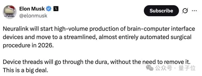 Neuralink将于2026年开始大规模生产脑机接口设备,并转向一种精简、几乎完全自动化的手术流程。