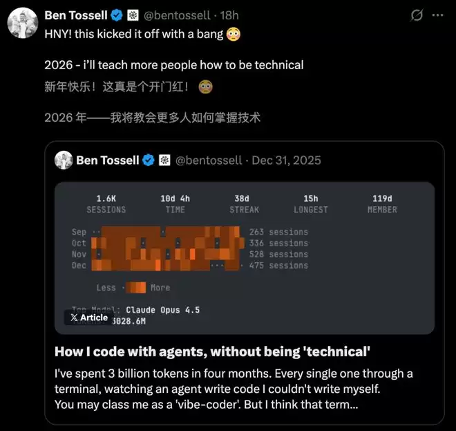 另一位非技术型程序员Ben Tossell四个月,烧掉30亿Token,用Claude Code连造50个项目。