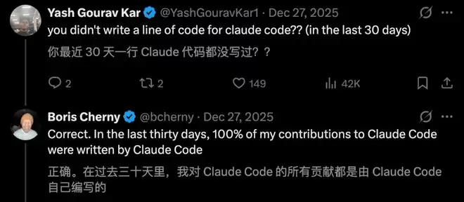 Anthropic工程师自曝,过去一个月,自己对Claude Code的贡献,全部由AI 100%直出代码。