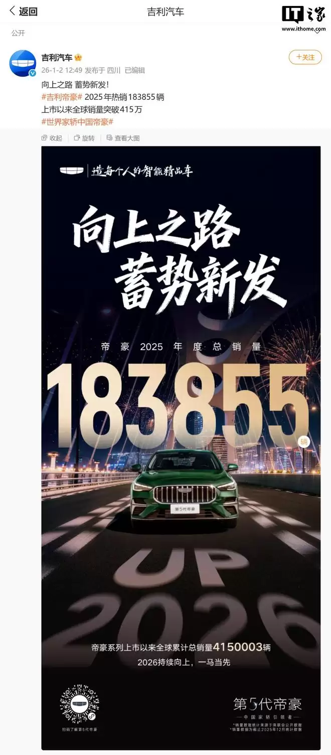 1月2日,知名科技媒体IT之家发布快讯,援引@吉利汽车 官方微博最新动态。吉利汽车于今日(1月2日)正式公布,旗下明星车型吉利帝豪在2025年表现强劲,全年热销183,855辆。自上市以来,帝豪系列全球累计销量已成功突破415万辆大关,展现出强大的市场号召力。与此同时,吉利中国星系列在2025年同样战绩斐然,全年累计销量达到1,214,132辆,延续了其在中国汽车市场的领先地位。