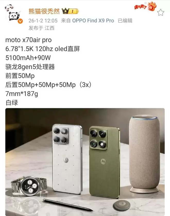 据IT之家1月2日消息,联想旗下moto X70 Air Pro手机预计将在近期发布。数码博主@熊猫很禿然今天曝光了新机的主要规格参数,IT之家现将信息整理如下: