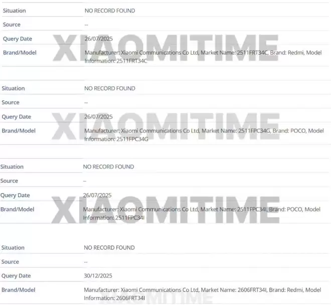 因为科技媒体XiaomiTime通过深挖GSMA IMEI数据库,发现了小米旗下新机型的明确编码,其中2511FRT34C与2606FRT34I等型号赫然在列。
