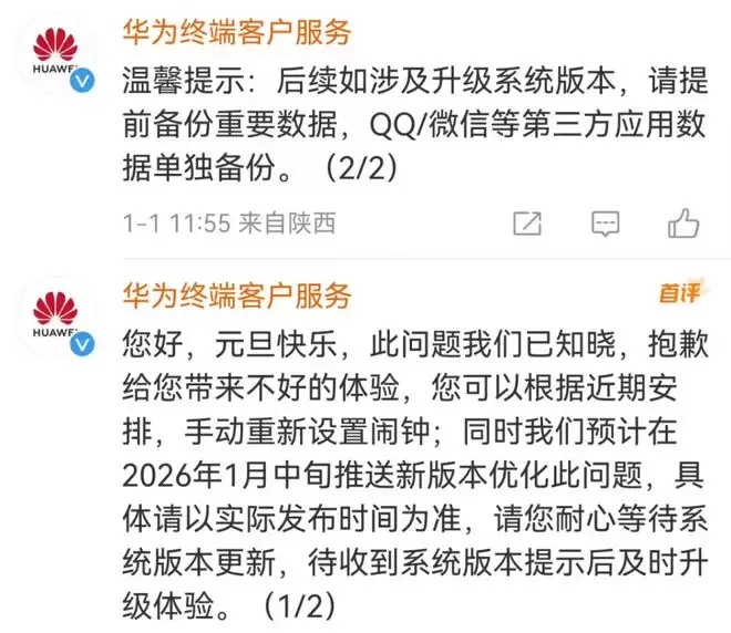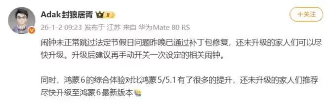 说实在的,这个Bug的罪状非常具体,在2025年12月31日(元旦假期)和2026年1月1日,本该静音的工作日闹钟,却在部分搭载鸿蒙6.0.0.120版本的设备上意外响起。