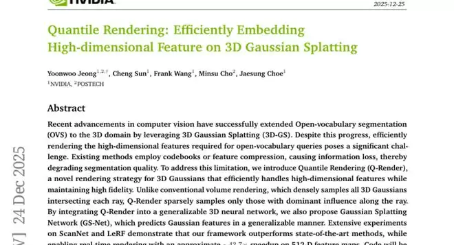 这项由NVIDIA公司与韩国POSTECH大学联合开展的研究发表于2025年12月,研究成果以"Quantile Rendering: Efficiently Embedding High-dimensional Feature on 3D Gaussian Splatting"为题发布。该研究的第一作者是POSTECH大学的郑允祐(Yoonwoo Jeong),通讯作者是NVIDIA的崔在成(Jaesung Choe)博士。感兴趣的读者可以通过论文编号arXiv:2512.20927v1查询完整论文。