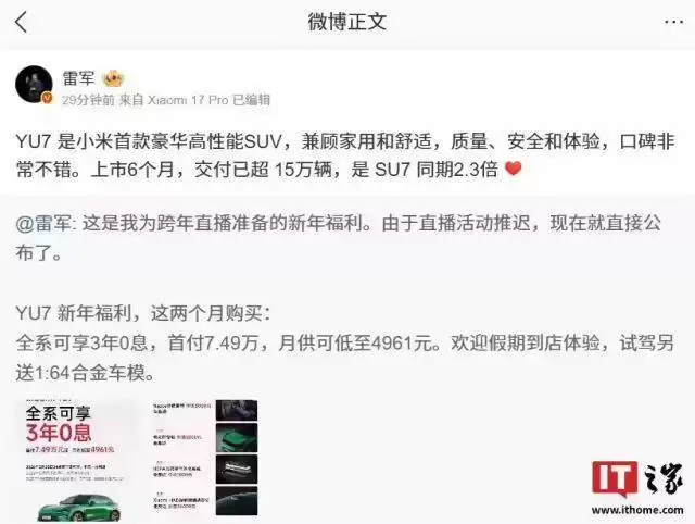 小米YU7上市半年交付破15万,领跑中大型SUV销量榜
