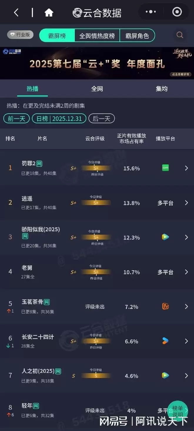 逆袭到了云合数据播放量第二的成绩,评级来到了S+,市场占有率达到13.8%。