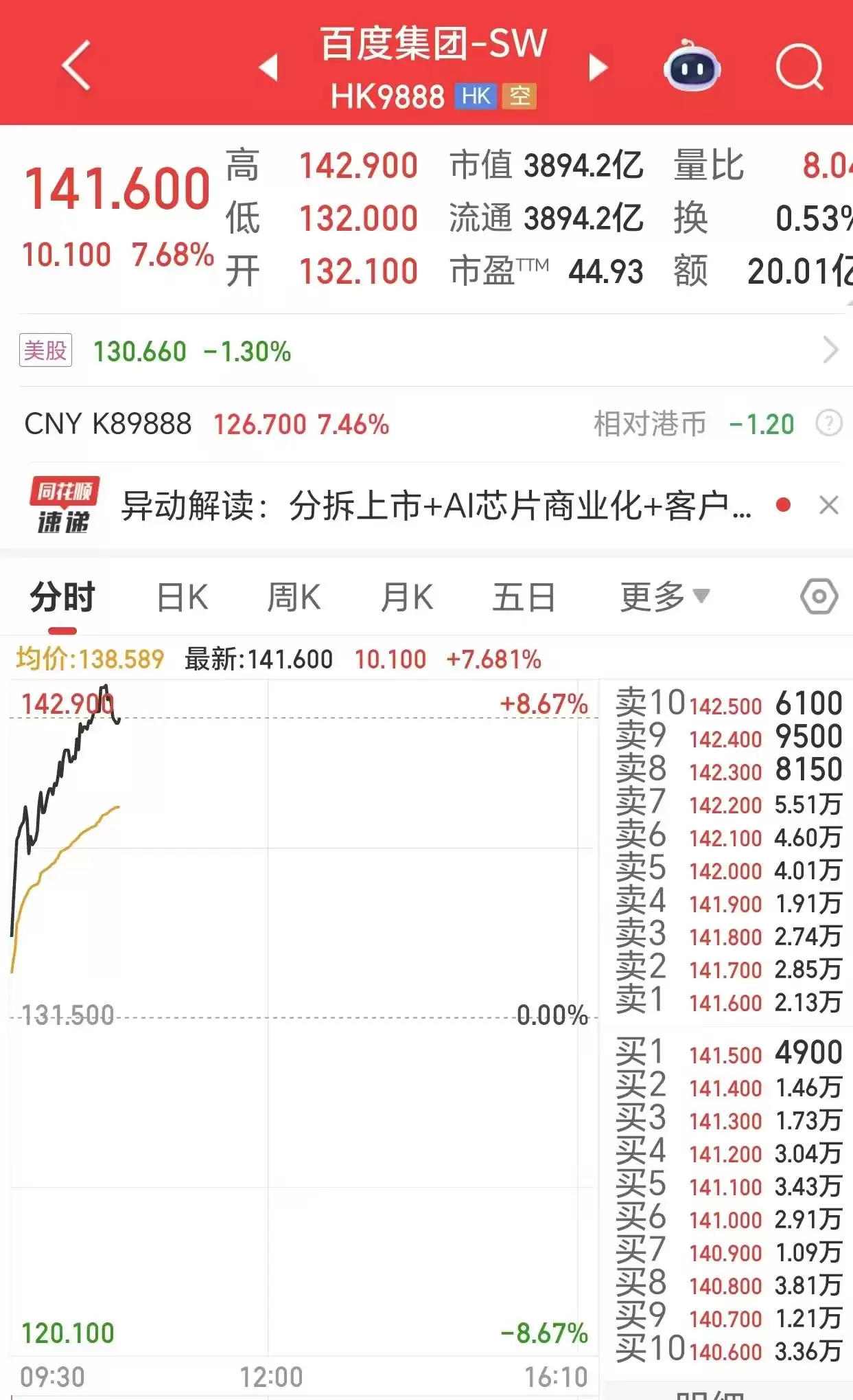 百度集团(09888.HK)已正式启动旗下昆仑芯(北京)科技公司的分拆上市流程。根据香港联交所发布的公告,百度已提交关于分拆其人工智能芯片业务主体昆仑芯的申请,并已获得监管机构认可,确认其符合上市规则。受此消息推动,百度港股在当日盘中一度飙升超过8%,最终收涨7.68%,总市值达到3894亿港元。