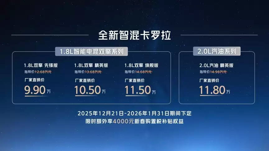 汽车市场正经历着前所未有的革新浪潮,一汽丰田全新智能混动卡罗拉正式登场,它以“全球好品质+中国新家轿”的双重定位,为中国消费者带来了全新的出行选择。此次焕新上市的全新智能混动卡罗拉共推出4个版本,厂商直销价区间为9.9万元至11.8万元。即日起至1月31日下定,消费者还可额外享受4000元新春购置税补贴权益。