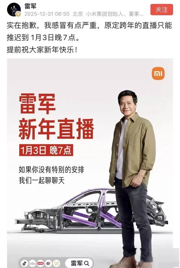 科技圈近日因两场备受瞩目的活动引发广泛讨论。小米创始人雷军原定于12月31日晚8点进行的跨年拆车直播临时推迟,最新解释为雷军因重感冒无法出席。这一变动迅速成为网络焦点,部分网友猜测背后另有隐情,认为罗永浩前一日举办的“科技春晚”可能对雷军团队造成了压力。