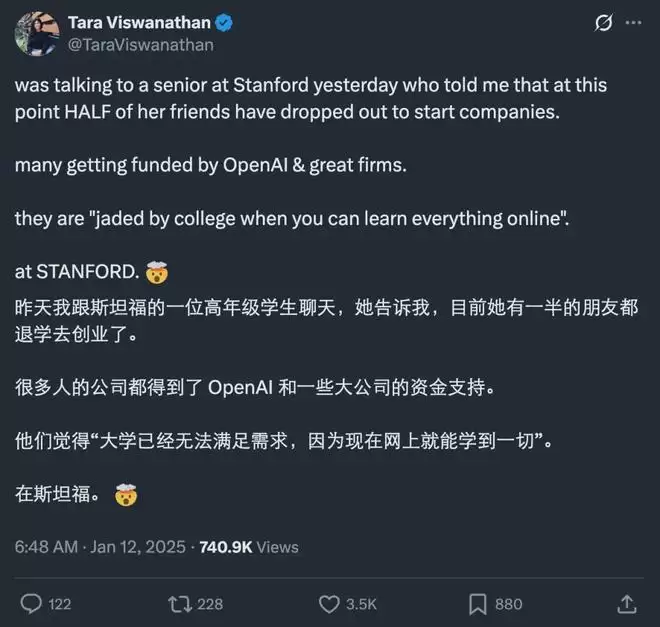 Moxxie Ventures 创始人兼普通合伙人 Katie Jacobs Stanton 表示:“据我所知,YC 并未正式追踪辍学数据,但从近几批学员的情况来看,有太多创始人会特意强调自己从大学、研究生院甚至高中辍学的经历。辍学本身已成为一种资历,体现出创业者对事业的坚定信念和投入。我认为在风投圈,这被视为相当正面的特质。”