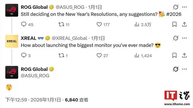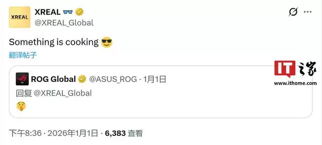 而到了2025年底,华硕ROG与XREAL两家的官方账号在2026年初展开了一系列互动,似乎暗示双方将联手推出ROG有史以来最大的“显示器”。这款产品预计将以XR智能眼镜的形态呈现,它没有传统的大型显示面板,自然也无需占据宝贵的桌面空间。