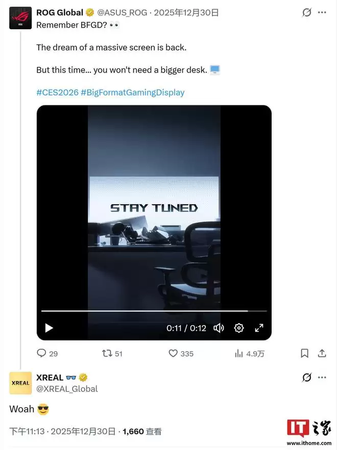 IT之家1月3日消息,华硕ROG官方社交平台在2025年12月30日发布了一段预热视频,暗示经典的BFGD概念即将以全新形式回归,而这次你甚至不需要为此准备一张更大的桌子。在该动态下方,XR智能眼镜厂商XREAL也积极回复,引发猜测。