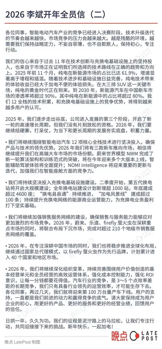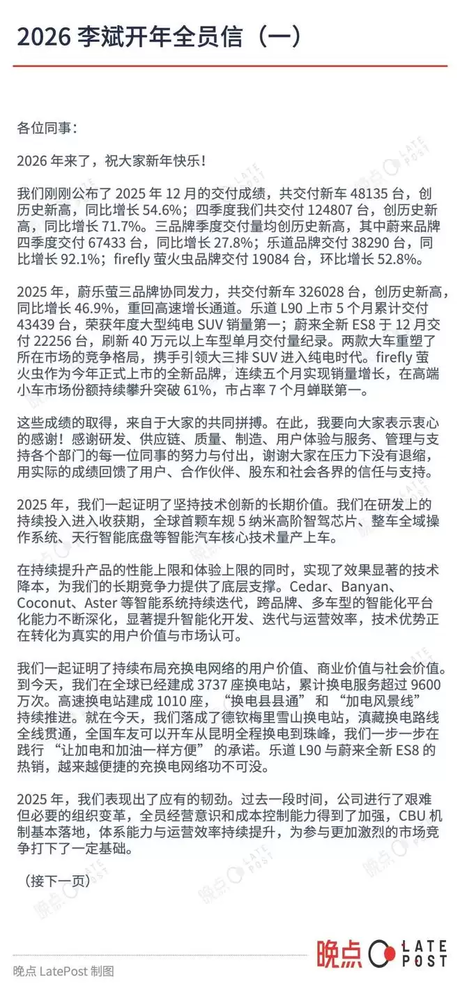 2026年元旦晚间,刚结束完藏换电贯涌直播的蔚来创始人、董事长兼CEO李斌,向全体员工发布了一封内部信。