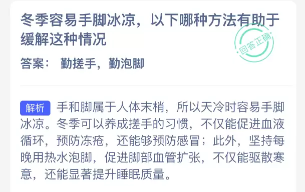 一到冬天手脚就冰凉,有什么好办法能缓解?支付宝小鸡课堂开课啦!每天花一分钟答题赚饲料,喂喂小鸡就能贡献爱心,轻松又有意义!2026年1月2日蚂蚁庄园的小鸡课堂题目正确答案是【勤搓手,勤泡脚】。冬季手脚冰凉主要与末梢血液循环不畅、阳气不足或体质虚弱有关。搓手可以通过摩擦快速生热,提升局部温度;泡脚则能扩张血管、促进血液循环,从而有效改善手脚冰凉的症状。