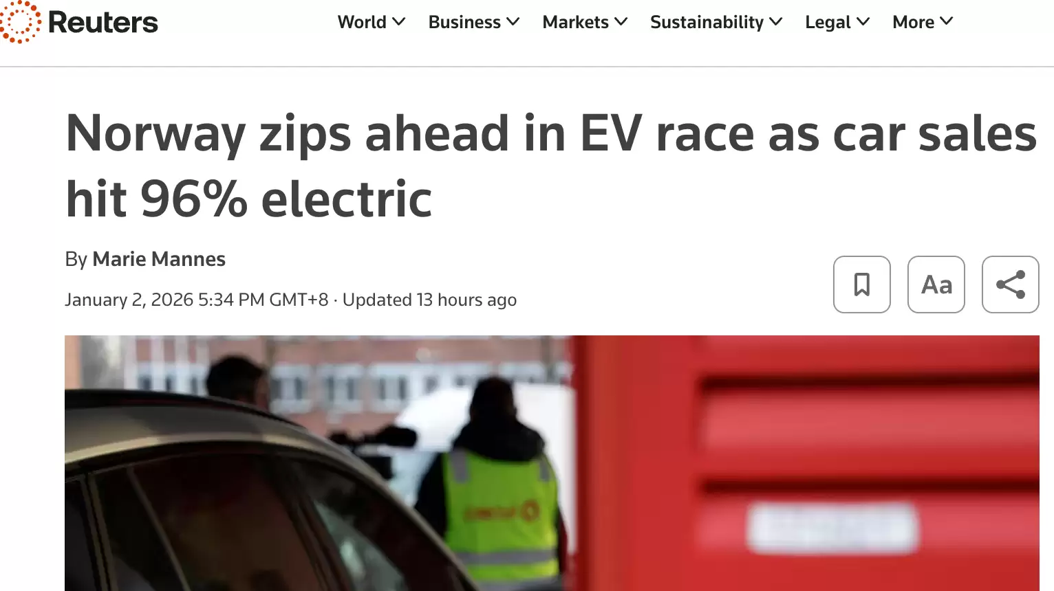 【环球网科技综合报道】路透社1月3日援引挪威道路交通信息委员会(OFV)最新数据称,在税收优惠政策的强力推动下,挪威汽车市场正在加速向电动化转型。2025年注册的所有新车中,电动车的占比高达95.9%;仅在去年12月,这一比例更是攀升至接近98%。相较于2024年88.9%的新车电动化率,实现了显著跃升。