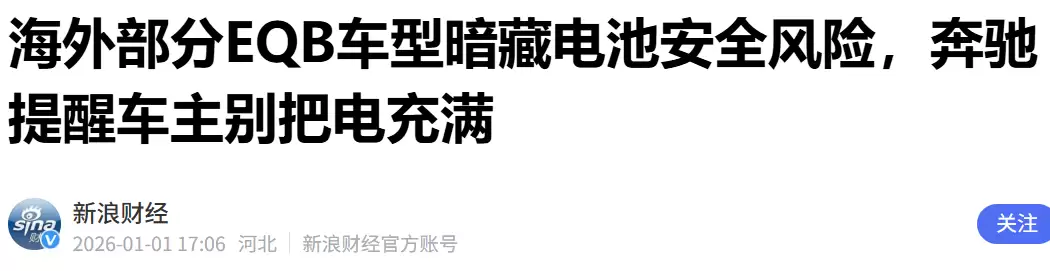 据电动知家消息,2026年1月1日,梅赛德斯-奔驰向部分EQB纯电SUV车主发出了一项重要安全警告:请勿将车辆电池电量完全充满,充电上限应控制在80%以内,以降低潜在的电池安全风险。此次受影响的车辆共计169辆,主要包括EQB 300 4MATIC、EQB 350 4MATIC车型以及少量EQB 250车型。奔驰强调,该问题仅存在于2023至2024年生产的早期EQB车型,后续生产的新款车辆已采用改进后的电池设计,不在此次风险范围内。