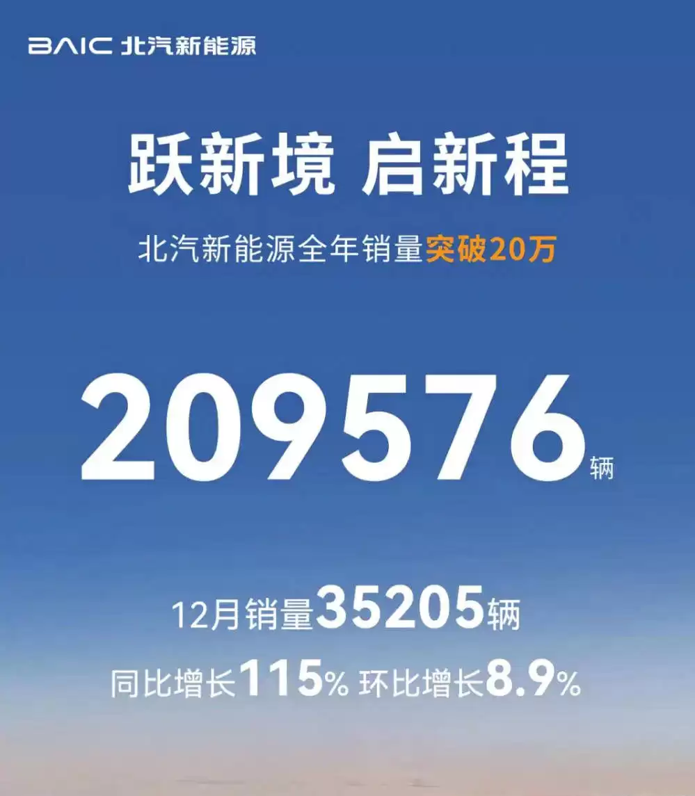 北汽新能源近日正式公布了2025年的全年销售业绩,其年度销量成功突破了20万辆大关,最终录得209,576辆,相较于上一年度实现了高达84%的显著增长。尤为亮眼的是其12月份的单月市场表现,销量达到35,205辆,同比激增115%,并且这已是该品牌连续第三个月保持月销量超过3万辆的强劲势头。