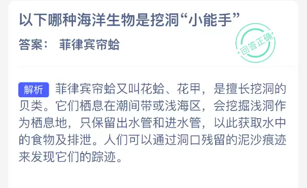 支付宝神奇海洋今日答案:哪种海洋生物是“挖洞小能手”?