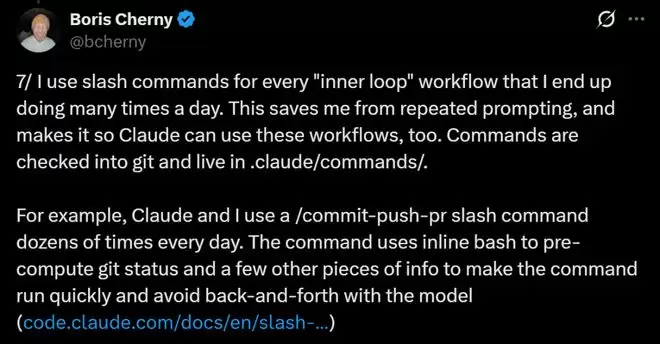 例如,Claude和他每天都会使用/commit-push-pr这个斜杠命令数十次。