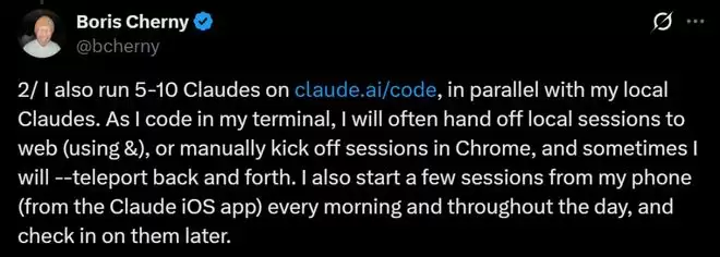 2.在Claude.ai/code上,也同时运行5-10个Claude。