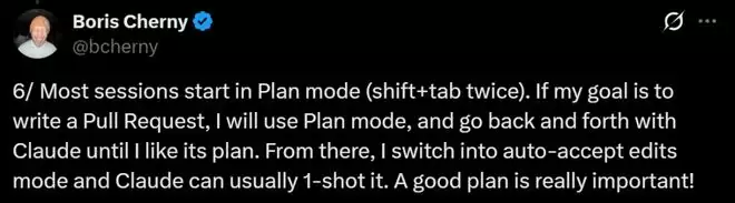 大多数会话以Plan模式启动。如果目标是写一个Pull Request,他就会使用Plan模式,并与Claude来回沟通,直到满意为止。