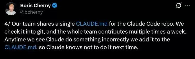 每次他们看到Claude做错事时,就会将其添加到CLAUDE.md ,这样Claude就知道,下次不能这样。