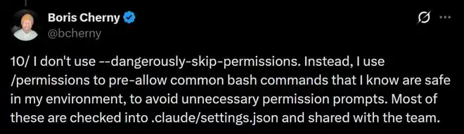 他不会使用--dangerously-skip-permissions。相反,他会通过/permissions预先放行那些能确认在当前环境中是安全的常用bash命令,从而避免频繁弹出不必要的权限提示。