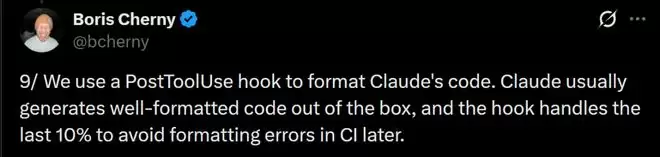他们团队会经常使用PostToolUse hook,来对Claude生成的代码进行格式化。