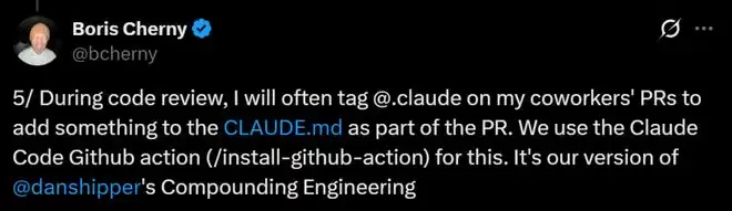 代码审查期间,他常常在同事的PR上标记@.claude,从而将某些内容添加到CLAUDE.md,作为PR的一部分。他们会使用Claude Code Github action (/install-github-action) ,来实现这一点。