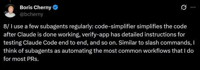 和斜杠命令类似,Boris把子代理看作是对大多数PR中最常见工作流的自动化封装,会把那些重复、固定的流程交给它们。