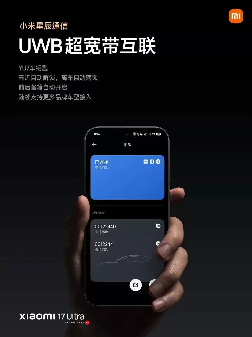 性能配置上,小米17 Ultra搭载了第五代骁龙8至尊版处理器,并配备了双路立体环形冷泵散热系统,内置6800mAh小米金沙江电池,支持PPS通用快充协议、90W有线秒充和50W无线秒充。通信方面,该机型搭载小米星宸通信系统,配备高性能天线组和5颗信号增强芯片,支持51个4G及5G频段。其UWB超宽带互联技术可实现小米YU7车钥匙功能,包括靠近自动解锁、开启前后备箱和离车自动落锁。