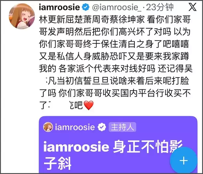 更直接吐槽说“哥哥们花钱压热搜删词条轻车熟路”,自己还有敏感内容没发,“到时候好好看看你家哥哥另一面吧”。