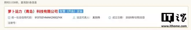 IT之家1月3日消息,据国家企业信用信息公示系统显示,萝卜运力(青岛)科技有限公司已于2025年12月22日在青岛市城阳区正式注册成立。该公司由萝卜运力(北京)科技有限公司全资控股,注册资本为100万元,法定代表人为吴刘伟。