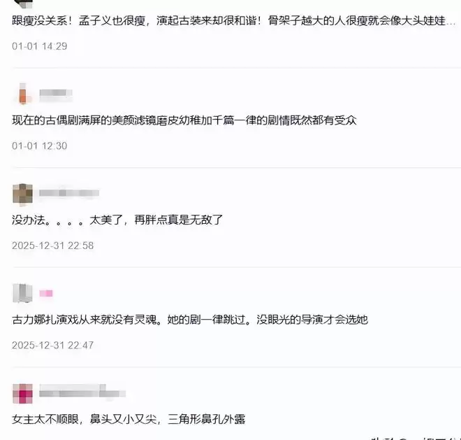 扮演者古力娜扎实在是瘦,风吹发动的惊艳镜头,都被她内凹的脸给毁了,看着都干巴巴的。