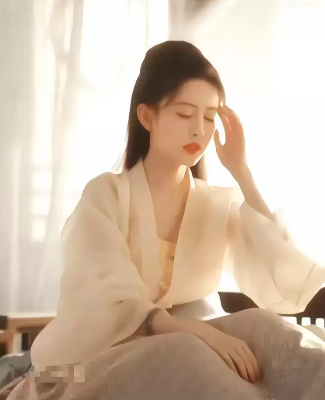 她单穿着一件白色大袖寝衣,但过于纤细的脖子、完美直角肩的身材、干瘪没肉的身材,都性缩力满满。