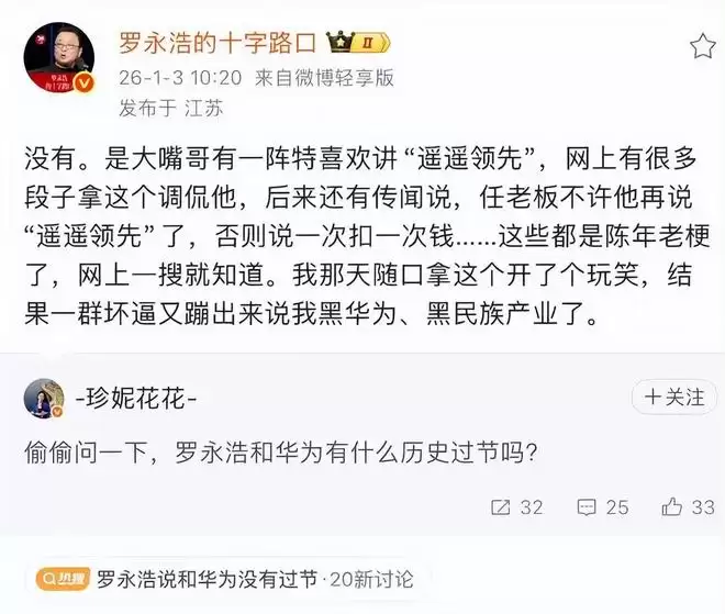 【罗永浩否认与华为有过节:提「遥遥领先」是开玩笑】1月3日,罗永浩回应网友提问“是否和华为有过节”,他表示与华为没有过节,提遥遥领先是开玩笑。罗永浩称,“是大嘴哥(余承东)有一阵特喜欢讲‘遥遥领先’,网上有很多段子拿这个调侃他,后来还有传闻说,任老板不许他再说“遥遥领先”了,否则说一次扣一次钱,这些都是陈年老梗了,网上一搜就知道。”他强调,自己当时只是顺着网络老梗随口调侃,没想到引发争议,“结果一群人又蹦出来说我黑华为、黑民族产业了”。据悉,罗永浩在“科技春晚”上提到“遥遥领先”,称“还有一个遥遥领先没那么遥遥领先,但也确实挺厉害,至少比锤子厉害多了。(大河报)