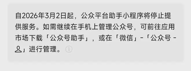 【微信小程序「公众平台助手」3月2日停止服务】1月3日,公众平台助手小程序发布公告,宣布自2026年3月2日起,公众平台助手小程序将停止提供服务。最新表示,如需继续在手机上管理公众号,可前往应用市场下载「公众号助手」,或点开「微信」-「公众号」进行管理。公开信息显示,公众平台助手小程序核心功能包括查看每日消息、留言互动、赞赏信息及最新通知等。(凤凰网科技)