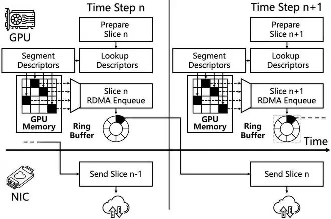 由于单个发送单元的网络传输时间通常长于 GPU 准备该单元所需的时间,GPU 侧的内存操作可以稳定地与网络传输重叠,使通信链路始终保持高利用率。